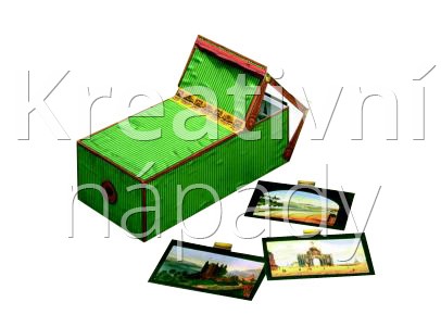 Od konce 17. století cestovali Evropou cirkusáci s těžkopádným zařízením na oslech, dvoukolových vozících, nebo na svých zádech. Tyto dřevěné bedny pak stavěli na tržnicích a nechávali obecenstvo nahlížet dovnitř malými štěrbinami s konvexními čočkami. Uvnitř beden byly obrázky, zpočátku ve formě kreseb nebo měděných leptů. Počátkem 19. století se menší verze těchto peepshow staly stále oblíbenějšími hračkami v soukromých domácnostech. Tento náš kartónový model vychází ze zařízení „Polyorama Panoptique“, jež je možno vidět v museu německého filmu ve Frankfurtu nad Mohanem. (Z technických důvodů se náš model od originálu poněkud liší. Pro pozorovatele je kupříkladu zřejmá změna při přechodu ze dne do noci; u výše zmíněného zařízení „Polyorama Panoptique“ se tato změna děje pomocí klapek v horní a zadní části skříně, jež umožňuje pozorovat obrázek osvětlený shora nebo zezadu. Měnící se obrázek je vytvořen ze dvou komplementárních a superponovaných, ručně vybarvených litografií na tenkém papíře, vsazených do dřevěného rámečku. Barvy na předním obrázku jsou poněkud bledé, zatímco barvy na zadním obrázku jsou výraznější. Další efekty se vytvářejí perforacemi, z nichž některé mají vzadu barevný litografický papír, takže vzniká dojem osvětlených oken, měsíce a hvězd, nebo plamenů. Nesčetné řady měnících se obrázků však neznázorňují jen přechod ze dne do noci, nýbrž také z klidného moře do rozbouřeného, z letní do zimní krajiny, nebo z celkových pohledů na detaily (zoo/lev). Toto důmyslné optické bylo založeno na velké stacionární diorámě Jacquesa Mande Daguerra.